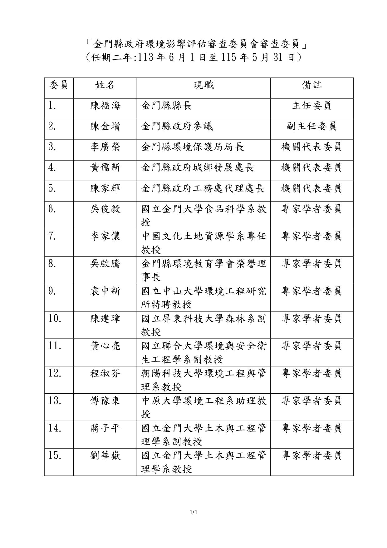 更新「金門縣政府環境影響評估審查委員會委員」名單。