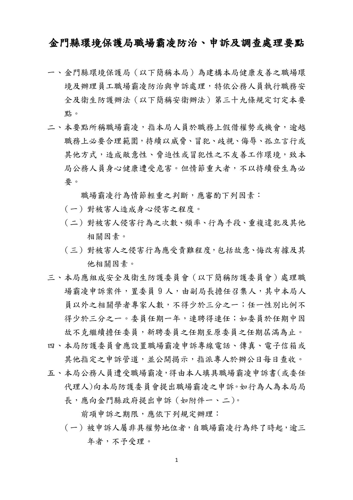 金門縣環境保護局職場霸凌防治、申訴及調查處理要點