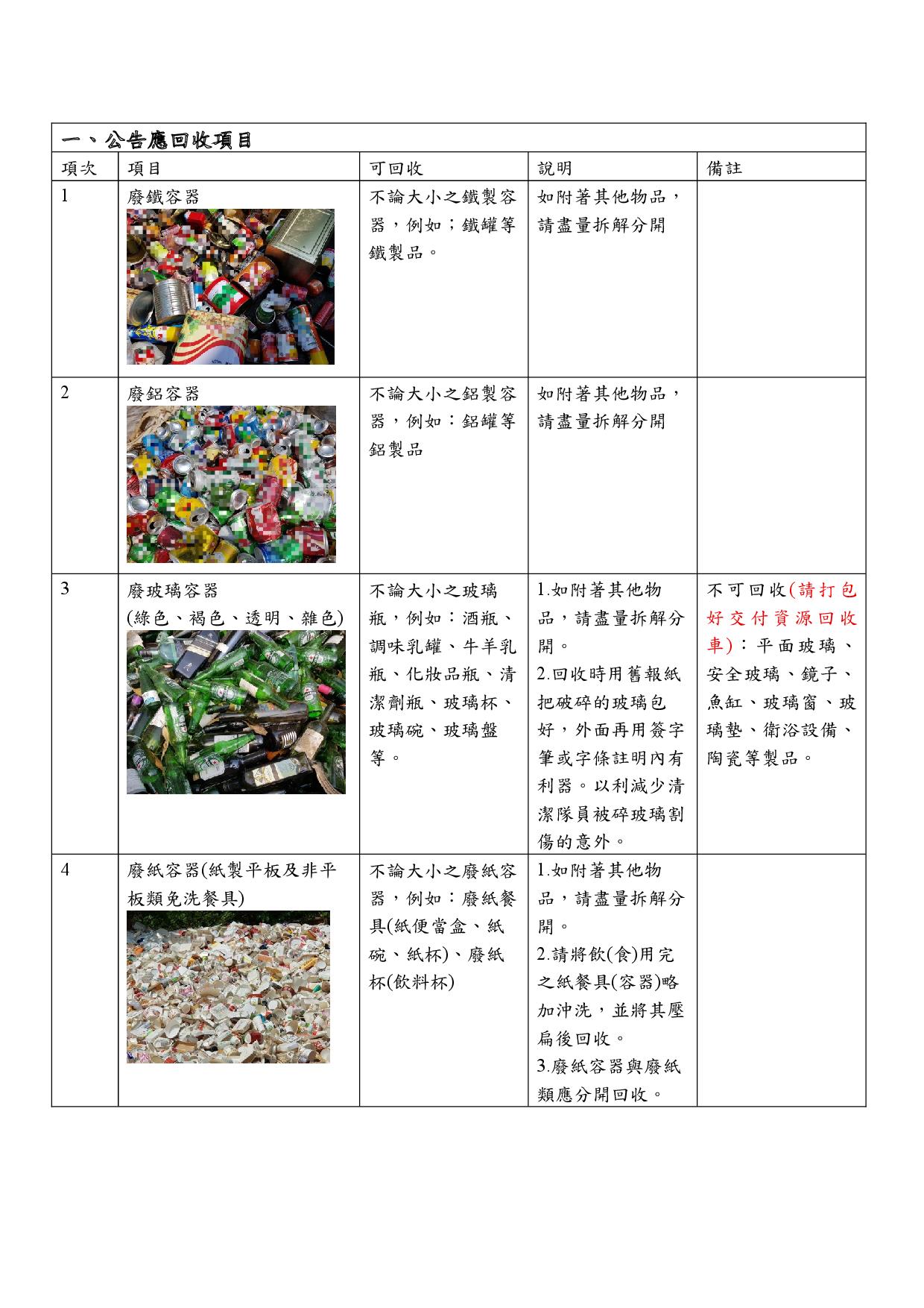 (說明:1.如附著其他物品,請盡量拆解分開。2.請將飲用完之鋁箔包及紙盒包容器略加沖洗或倒空內容物,並將其壓扁後回收。3.廢紙容器與廢紙類應分開回收。)